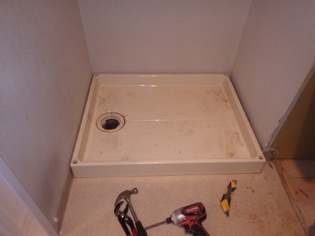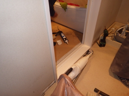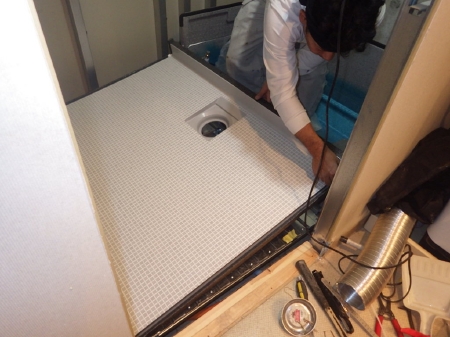 | 一方こちらでは浴室ドアの解体作業も進んでおります。 | 浴室の床板を設置していき、配管の取り付け作業を行っていきます。 | その上から浴槽の防水パンを乗せました。 マンションの浴槽は防水がしっかりしているこのような土台が必須になります。 |