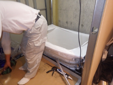 | 床面土台の上に職人により、浴室の床材が敷かれていきます。 | いよいよ浴槽が取り付けられました。 今回の浴槽は「マンションリモデルWGシリーズ」となっております。 |
