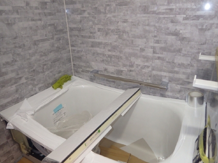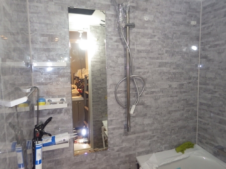 | 使いやすい大きな鏡とシャワーなども設置されていき、いよいよ浴室らしくなってきましたね。 | 浴槽は人口大理石製の高級感あるものを。 ピカピカな設備が素敵な浴槽にリフォームされていきます。 |