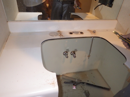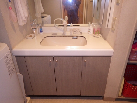 | こちらは施工前の洗面化粧台です。 洗面ボウルにひび割れが起きており、そちらもお悩みのようでした。 |