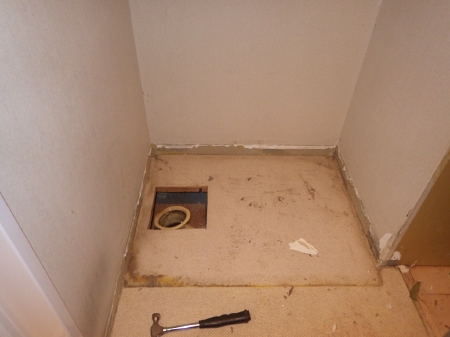 | 洗面所にある洗濯パンを交換していきます。 | 撤去後、新しいものを設置していきます。 | 洗面所壁面のクロス張替えが完了いたしました。 |