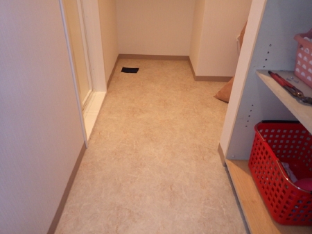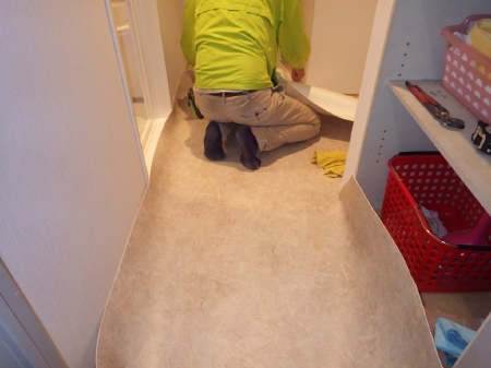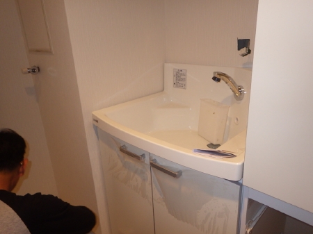 | 床のクッションフロアシートも一緒に張替えを行います。 | 綺麗に張られた床面が美しいですね。空間がぎゅっと引き締まった印象になります。 | 最後に新しい洗面化粧台が取り付けられていきます。 |