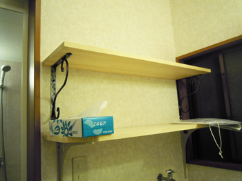 | 床はすぐにカラリと乾くので、転倒する心配もなく安全にバスタイムを楽しんで頂けます。 | 洗面所には、便利な収納棚を取り付けさせて頂きました。 洗濯機の上のデットスペースを利用しています。 |