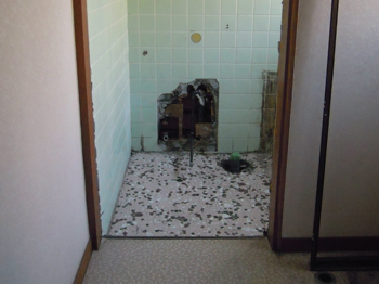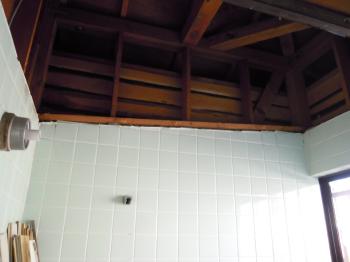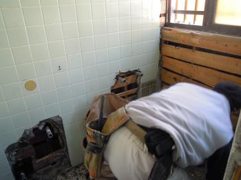 | 既存の浴室を撤去していきます。 | 天井の解体を行ったところです。 | 窓際のタイルを解体しているところです。 |