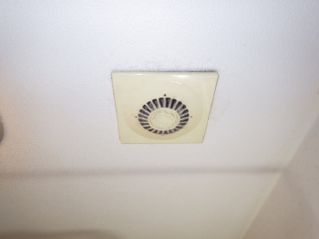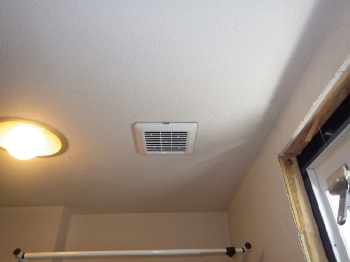 | 次に、浴室内に手すりと鏡を取り付けていきます。大きい鏡と頑丈な手すりで、便利に暮らしていただけますね。 | 今回のリフォームでは、いつでも暖かいお風呂に入れるように自動湯沸かし器も取り付けていきます。 | こちらは洗面所の天井にある換気口です。 浴室換気、トイレの換気と一体になっている三室同時換気タイプのものでした。 |