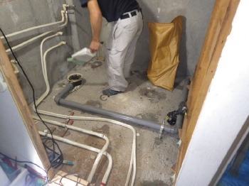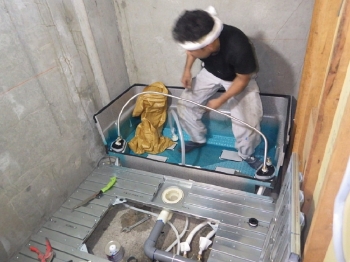 | 次に、浴室の床を撤去していきます。 | 既存の排水管は切り出し、新しい塩ビ管のものへと交換していきます。 | 床部分にユニットを組み、浴槽の土台を設置しました。同時に配管の処理も行います。 |