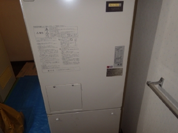 | ピカピカの枠を取り付け、この後ドアを設置していきます。 | これにて浴室のリフォームが完了しました。 | ここからは給湯器のリフォームに移っていきます。お湯を利用して温風により和室を暖めることができる、暖房機能付きの給湯器でした。 |