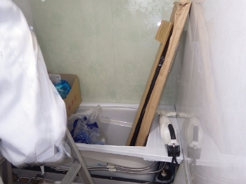 | 次に、既存の浴槽を解体していきます。 見えない箇所には長年の汚れが溜まっていました。 |