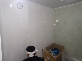 | 天井にもパネルを張っていきます。 真っ白で気持ちの良い、綺麗なパネルです。 |