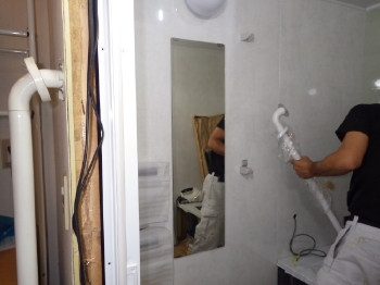 浴室壁の解体作業をしているお写真です。 |