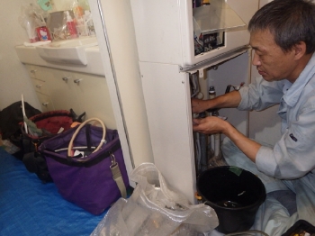 | 職人の慣れた手つきで、あっという間に解体作業が進んでいきます。 | 配管部分を残して、給湯器の解体作業が完了しました。 | 新しい給湯器を取り付けていきます。 |