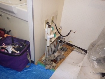 次にユニットバスを組み立てていきます。この作業で一気にお風呂らしくなっていきましたね。 | 浴槽のエプロン内側部分にも配管を通していきます。 |