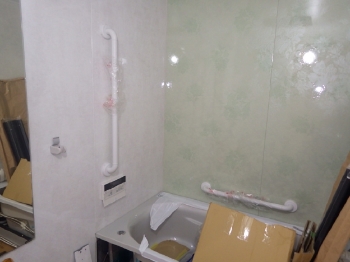 | 天井部分、既存の浴室乾燥機も撤去が完了しました。 | ここから、いよいよ新しい浴槽や給湯器を運び入れていきます。 | まずは浴室壁面に、明るい薄めのグリーンのパネルを張っていきます。空間が明るくなりますね。 |