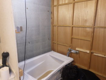 防水パンとユニット土台を設置し、ユニットバスを運び入れ組み立てを行います。