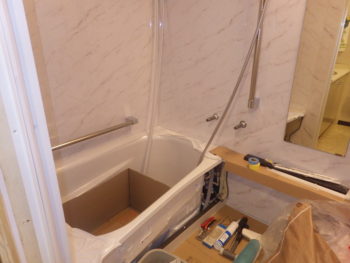 大理石調のバスパネルを張り、手すりや鏡などの取り付けを進めていきます。