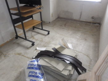 カーペット貼りの洋室はフローリング貼りへリフォームするため、既存床を剥がしていきます。