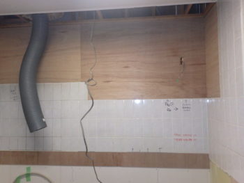 こちらではレンジフードや吊戸棚の取り付けが進んでおります。かわいらしい淡い色味の化粧板が貼られました。
