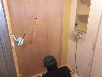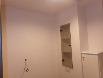 大きな鏡を取り付けるため下地にベニヤを貼り補強いたします。