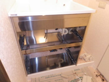 新しい洗面化粧台を運び入れ、組み立てを行っていきます。