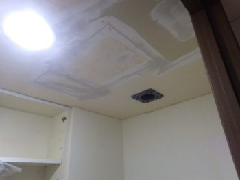開口した天井は埋め直し、パテ埋めで段差をなくしたうえでクロスを貼っていきます。