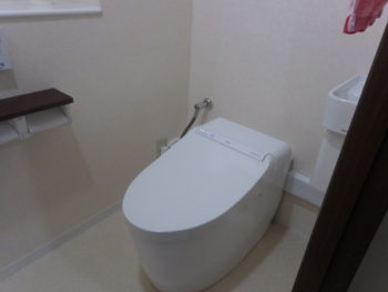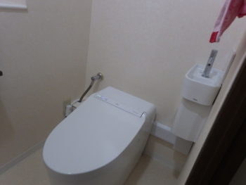 トイレはタンクレスモデルで空間に圧迫感を与えないTOTOのネオレストにてリフォームを行いました。向かって右側に見えるのはコーナータイプの手洗い器です。
