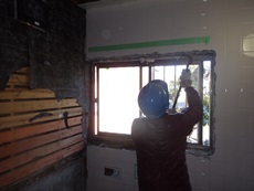 窓の枠にも新しいパネルを貼りつけるので、慎重に作業します。 |
