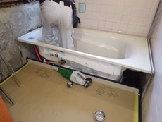 浴槽の周りに新しいパネルをはりつけていきます。 |