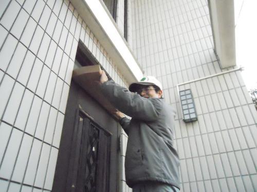 | 木枠を 玄関に つけます。 | 角度を変えるため 三角形の 木枠を つけます。 |