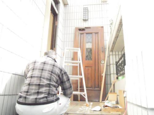 玄関ドアをはずし タイルを 貼っていきます。 |