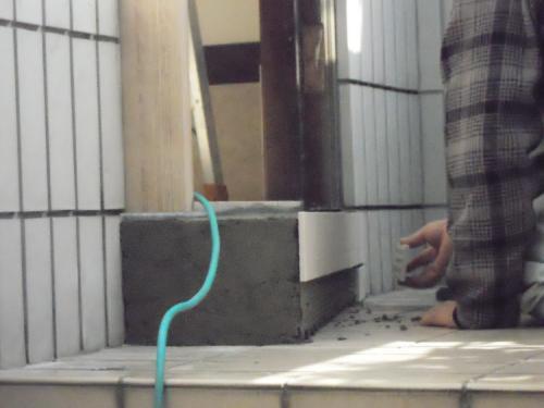 | タイルの形を 調整しています。 | タイルを貼り終え ドアの 開け閉めを 調整しています。 |