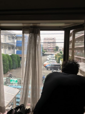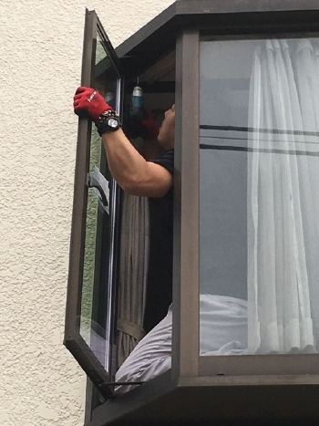 | 次に、二階出窓のガラスを交換していきます。 | まずは既存の窓ガラスを外していきます。 | 外から見るとこのような感じになっています。 |