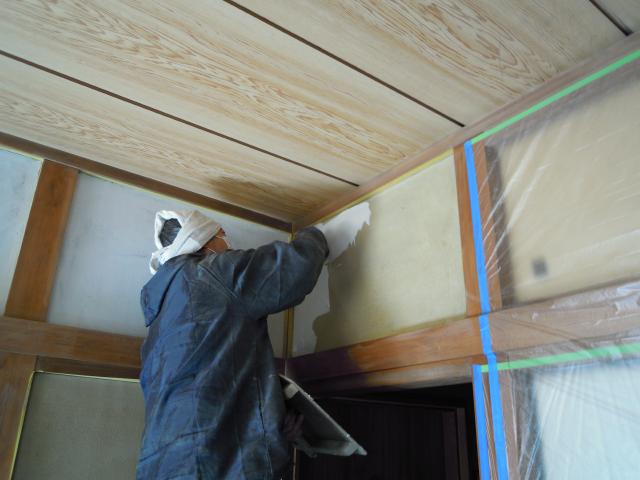 | まずは壁の工事を行っていきます。傷つけないように養生を行っていきます。 | 天井もクロスを剥がしていきます。壁と天井を一新していきます! | 壁を塗壁にしていきます。最近すくなりましたが、やはりこうした塗壁はいいものです。 |