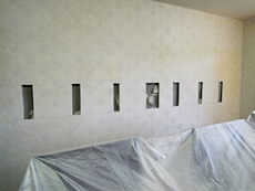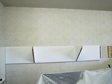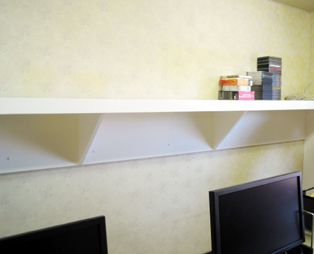 | 支柱、棚受けを設けていきます。 | 壁掛け棚を作るにあたり、それを支えるための基礎を準備します。 | 基礎をの上に棚を設けていきます。 |