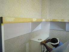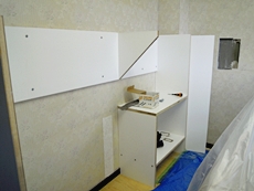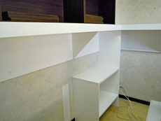 | 棚受け部分が完成しました。 | 天板をのせて、下部に収納を設けていきます。 | 天板も含め、細かい部分を仕上げます。 |