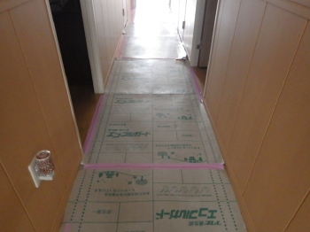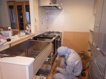 | 施工に入る前に、お家の通路等を傷つけることの無いように丁寧に養生していきます。 | まず初めに、既存のキッチンを丁寧に解体していきます。 | 今回はキッチンと合わせて、収納カップボードも交換をしていきます。 |