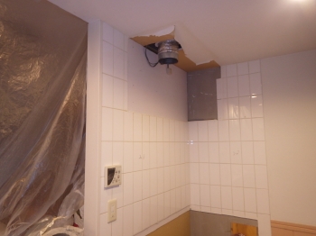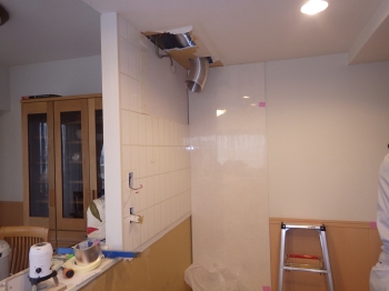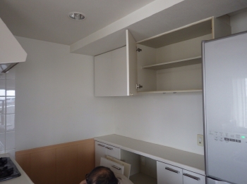 | 換気ダクト移設の為に、天井を一部開口して左から右へと移設工事をしていきます。 | 真新しいカップボードが取り付けられていきます。 こちらのカップボード、収納力も抜群です。 |