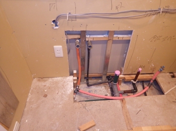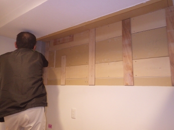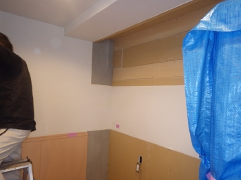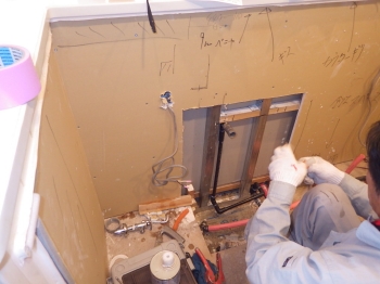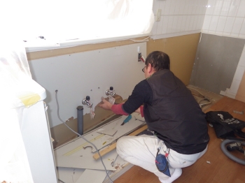 | 次にキッチン給水管部分の工事が進んでいきます。 | 電気屋さんによって、タッチセンサー付き水栓の電源確保の為、コンセントも今回新たに増設しています。 | カップボード部分の施工に入っていきます。まずは壁面に、下地となるパネルを張っていきます。 |