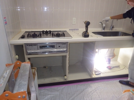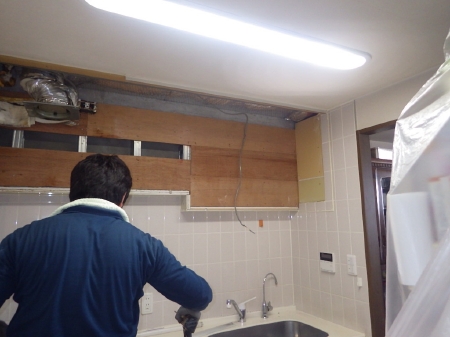 | 養生を丁寧に行い、まずはキッチンの解体から行っていきます。 | 段差があり圧迫感があった吊戸棚も撤去完了です。 | 既存キッチンと吊戸棚の解体作業が完了いたしました。 |