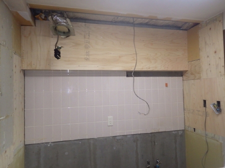 | ここからは洗面所のリフォームです、まずは既存洗面化粧台を解体いたしました。 | 洗面所天井の換気口を取り外したお写真です。 | 洗面化粧台の撤去後には壁面を開口し、丈夫な下地を作りなおしていきます。 |
