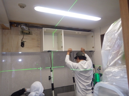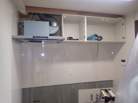 | キッチンの取り付けに伴い専用の器具を使って水平を取っていきます。 | 吊戸棚とレンジフードの取り付けが完了いたしました。 | ビルトインコンロとシンク、化粧扉などの収納棚を取り付けてキッチン交換が完了です。 |