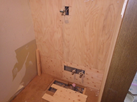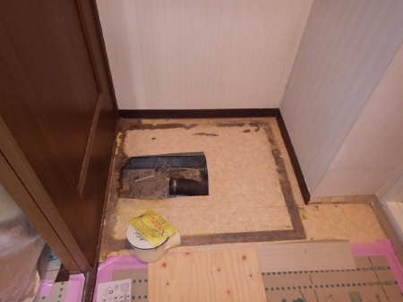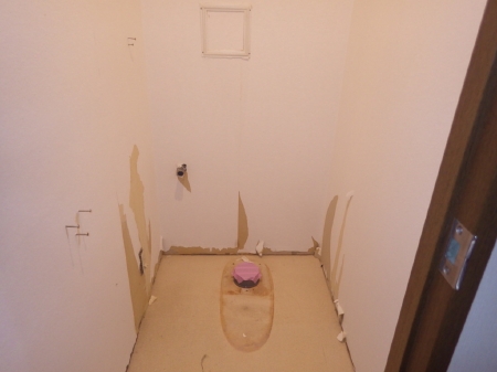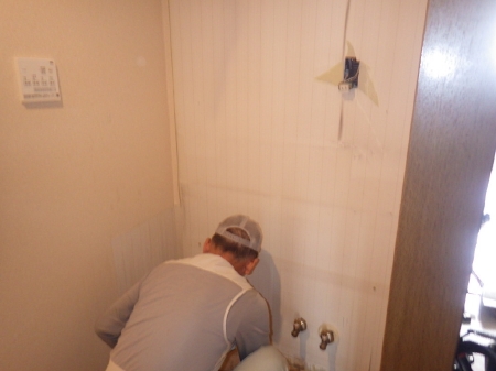 | コンパネを壁面に貼り、重量のある鏡を取り付けても問題ない丈夫な下地を作っていきます。この後に新しい洗面化粧台が取り付けられます | こちらでは洗濯パンの取り外しが行われました。 | 築27年、汚れも目立ってきたトイレの交換に移っていきます。 |