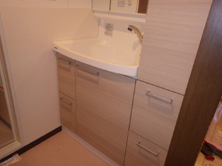 洗面化粧台は木目が落ち着いた印象を与えるお洒落なものへと交換を行いました。高い位置に収納も多く、使い勝手もよさそうですね。 |