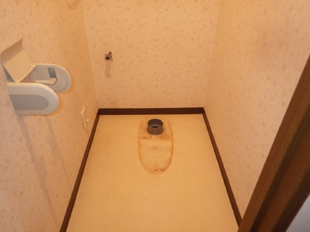 | 既存便器の解体が完了いたしました。 | 壁面天井のクロスとクッションフロアシートを剥がし、こちらも貼り替えを行います。 | |