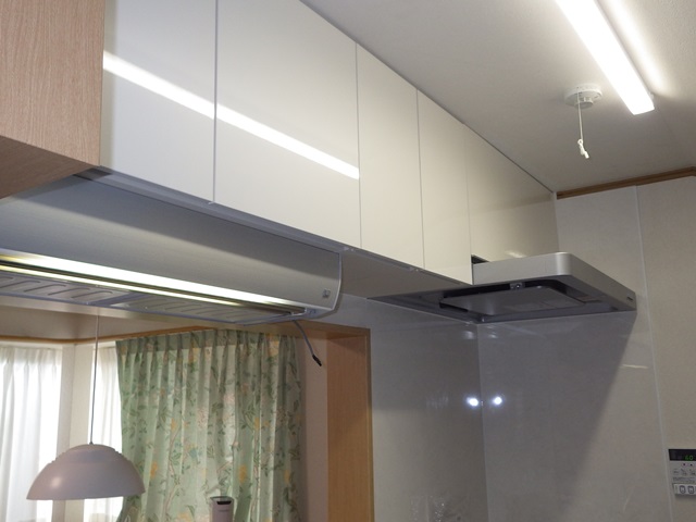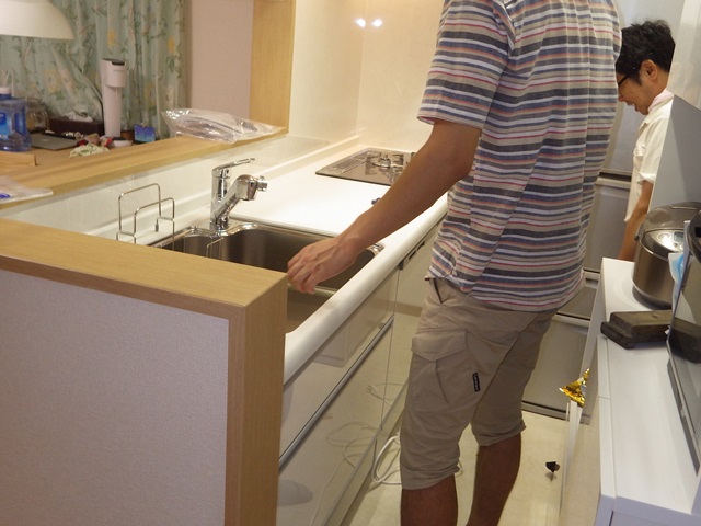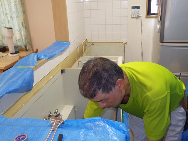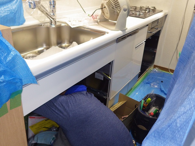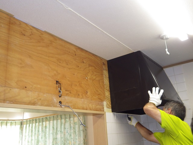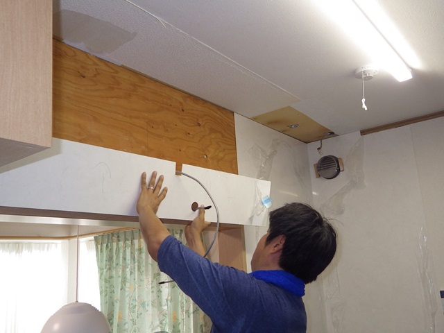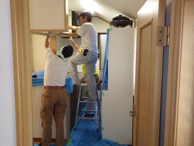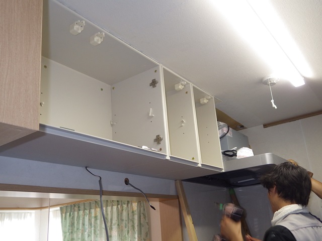 | 吊り戸棚の取り付けです。2人掛かりで作業を行いました。 | 吊り戸棚、換気扇の完成です。吊戸棚に照明が反射してキッチンが明るくなる効果もあります。 | キッチン本体の取り付けと配管の接続をしています。 |
