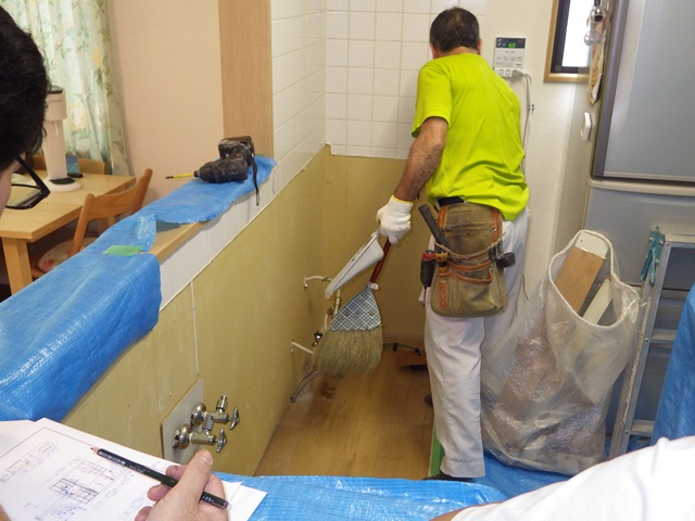 | 吊り戸棚の取り外しは大人が3人掛かりで行いました。 | 換気扇の取り外しを行っています。 | キッチン本体も全て取り外します。 |