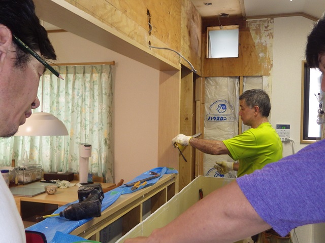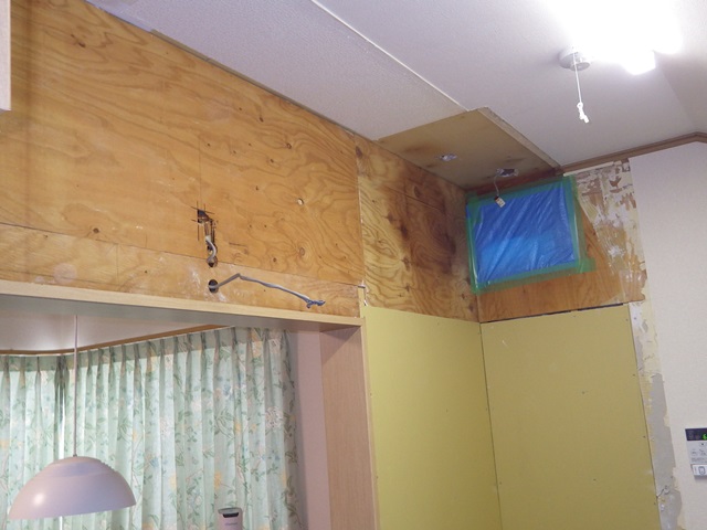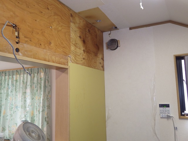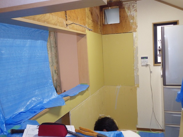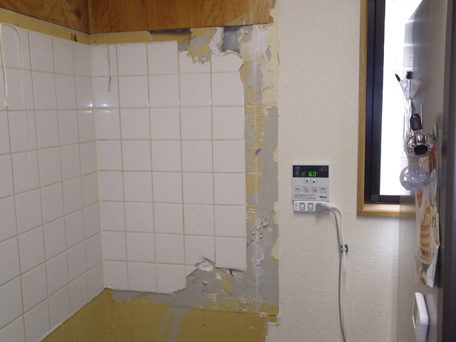 | キッチンの部分が全てなくなりました。 | 壁に貼ってあったタイルをはがします。石膏ボードも一緒にはがれてしまいますので新しくします。 | 石膏ボードの取り付け作業中です。 |