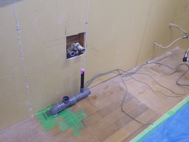 | 新しくした石膏ボードのうえにキッチンパネルを貼ります。 | 吊り戸棚、換気扇の部分はこんな状態になりました。 | 配管も新しくしました。 |