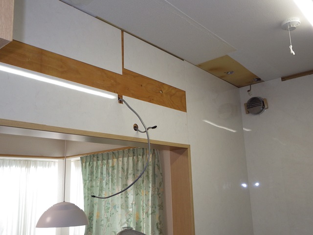 | 吊り戸棚をこれから取り付けます。 | キッチンパネルを貼っています。 | 張り替えた石膏ボードの上にキッチンパネルを貼ります。 |