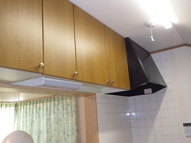 | 施工前のキッチンです。このキッチンを新しいものへと取り換えます。 | 施工前の吊り戸棚と換気扇です。 |