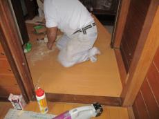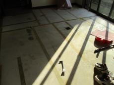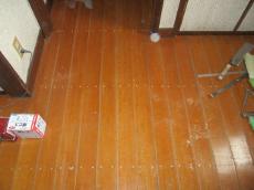 | 補強後には専用の接着剤を使い、穴を埋めていきます。 | 廊下の張替えも順調に進んでいきます。 | 上にフローリングを張っていく為に、床を下地として使っていくので、ビスを打ち 、床鳴り防止の施工を加えます。 |